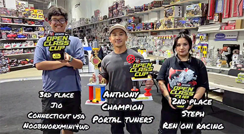 Hobbytown Open Class Cup - July 5, 2025 - Several fun non-qualifying events prefaced the final Open Class Cup race, including categories for Trucks, Drag Race, Box Stock, BMAX, and Tuned. Each had a corresponding big trophy. I was unsuccessful in Tuned class with Eagle and Hellboy. Both cars made valiant attempts against the stellar competition of 40+ racers, but neither made it to the semifinals. I was moderately successful in the final race that started at 10:30pm. My new Open Class car, yet to be named and made with MadTang's 6th Gen chassis and Lite Dash motor, had a chance at the semifinals, but met its untimely demise at the hands of a rubbed off brake stuck at the start of the incline. My other car, Grim Reaper, made it to the semifinals with a HyperDash motor, but trailed the leader due to a voltage issue. Still, what I achieved was very good. I pitted an Open Class VZ (Grim Reaper) car against mostly MS suspension cars. My unnamed Open Class MS suspension car was built just a couple of days prior. Against 30+ racers, I was outclassed against racers who had better OTFA (on-the-fly-adjustment) skills. Anthony from Portal Tuners took the final spot in the five rounds of semifinals winners and won Gold in the Open Cup. Mason/Stephanie won Silver and Jio won Bronze.