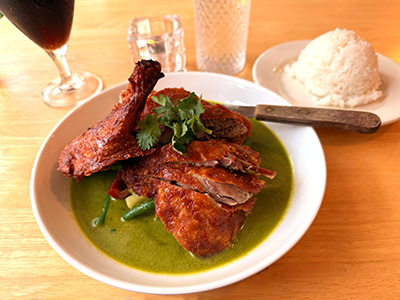 Let me say again that the duck is extraordinary. The crispy skin is heavenly. You will want to order the Red|Yellow|Green Curry version rather than the Lovely Duck Creamy Special version because the latter smothers the duck in the curry sauce and mitigates the crunch. Not counting the duck leg, the duck is mostly deboned, making it easy to eat. I found two extra bones in it, a rib and a joint that was part of the leg, but overall this was beautifully executed. The included steak knife easily cut through the pieces and all pieces were meaty and delicious. You really can't get much better duck anywhere unless you get a good one in Chinatown. A good curry makes you want to sop up the last remnants of it with rice. You might even find yourself wanting more curry and rice. Only Indian curries can rival these kinds of flavors, but I would say Thai curries have an edge over Indian curries for me, if only because they are sweeter in taste. In the background is the requisite single-person serving of steamed rice and a lovely glass of Chateau de Coca-Cola, vintage 2026, a most complementary pairing.