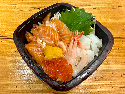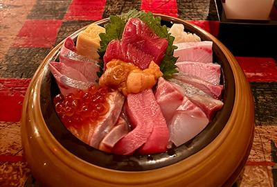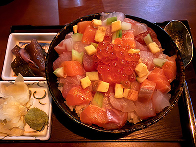 At $35, it's better than Kei Sushi's chirashi, but could be ranked higher with bigger portions. The scraps of salmon belly were so small as to be almost nonexistant. Are they just trying to give us a hint rather than a taste? The scallop was chopped up, funnily enough, to look like scraps. Gosh, please stop making chirashi look like scrap fish over rice! We're paying good money for this, not a ten-spot for a plastic container filled with odds and ends. That reminds me of a roommate of mine from long ago who recommended I purchase scrap salmon from the supermarket to save money. Scrap salmon came in small plastic containters. That was back in my poor days. "The fish tastes the same after you cook it," she said. That was the best tip ever. For a chirashi to be so fish-focused is good, but I would've liked to have seen some ikura in it. Just replace one of the fish with ikura. That would elevate this dish to the next level. And please put all of this fine fish over rice! That's chirashi! This is just sashimi with rice on the side.