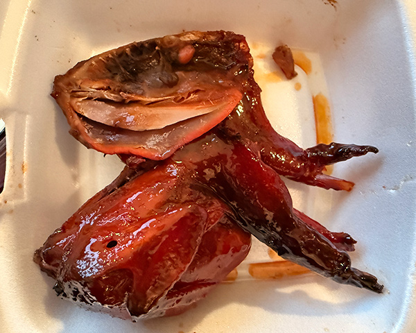 I've been coming here for roast meats for a long time. Their roast duck is always a winner. Today, I tried their Honey BBQ Quail. It is the Holy Grail of quail! The flavor is amazing. The meat is a bit firmer than I'd like but each bird is only $5! If you are patient with your picking, you will be handsomely rewarded with some very delicious, flavorful bites. It's like eating a tiny chicken that tastes more like duck. Just remember that these are fully grown quails. They're really that tiny! Siu Kee cuts them in half, right down the middle. Be careful of the ribs and other small bones. They are very delicate. Some people eat the bones because they're thin, hollow, and crispy like potato chips, but I suggest avoiding them and going for the meat. There are tiny morsels of meat and skin to enjoy on their tiny wings and legs. Just think... you are eating a little dinosaur! That finger-lickin' good sauce that coats the quail is something to marvel over. Honey BBQ? Sign me up for some bottles of that! I think it's the same sauce as on their roast pork. If two quails are not enough, get three. You're bound to find that heavenly bite in there somewhere. It looks and tastes almost like... almost like... a little tandoori chicken! That same charred tips taste. But tandoori chicken isn't sweet. This is. That's what makes this special. This is not a sit-down restaurant, but more of a takeout place selling meats and meals. I recommend the roast duck on rice, which comes with a side of leafy greens. Authentic Cantonese soul food right here!
