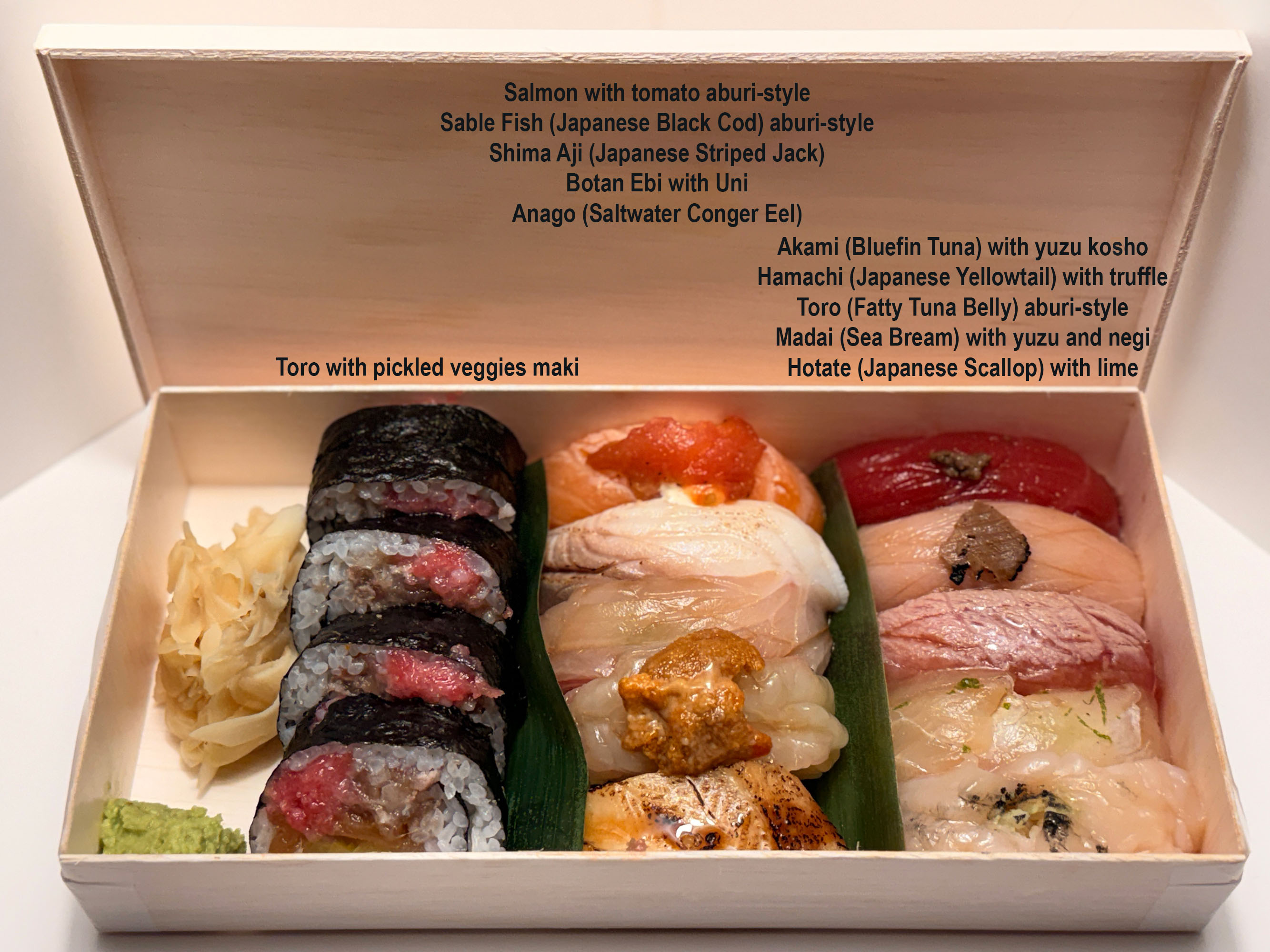10 pieces of assorted nigiri sushi and a Toro pickled veggies maki roll. Delicious! That's a slab of real wasabi root right there in the lower left corner. Zesty hot, but not too hot like the wasabi toothpaste served at other sushi restaurants. The ginger... well, I don't care for it. It's not a knock against Yuhiro's ginger, but ginger in general. I'm not a fan of ginger unless it's ginger scallion wok-cooked fish. The Toro with pickled veggies roll didn't look too impressive at first, but it quickly stood out as an impressive bite... or four. If I may be so bold, but what I thought of as a mistake at first turned out to look like a maki roll with a flower design with the toro as the flower petals and the pickles as the stem and leaves. Okay, maybe the chef just put it together without any intention, but I don't think so. He took good to great care with each piece of nigiri, so I think the roll had a theme, too, even if subconsciously. The ordering of the nigiri has me a little confused. The best piece - the akami - was first. What could possibly top one of the best pieces of akami in Philadelphia? The way they meticulously trim away all the sinews in the flesh makes their akami one of the most decadent, melt-in-your-mouth experiences around. The hamachi with truffle is almost as good as the akami. The toro was disappointing this time around. There were unchewable sinews in mine. I hadn't experienced this before in their sit-down omakase. I could forgive the toro if the rest of the pieces were perfect, and they were so all is forgiven. The madai was good, the hotate scallop was better, the salmon was better still. Then the sable fish hit and it hit hard... it was PERFECT. It didn't need any topping. Cooked back to raw in shima aji... such flavor! Botan ebi with uni... even more flavor! Finally, the pièce de résistance... that final piece... the anago with foie gras butter was amazing... just amazing. How do you eat this? One piece at a time, as if you were served one piece at a time at a sit-down omakase. But let's be real. You can rearrange the order of consumption. You can interleave the four pieces of toro maki with the nigiri. You don't have to follow the order. But, if you do, you'll get to experience what the sit-down omakase is like, but without the warm, seasoned rice. For just $12 more, I'd much rather do that, but if I'm in a hurry or don't have much time to devote to dinner, this takeout box is the next best thing.