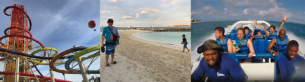 Our second excursion day was at Perfect Day at Coco Cay. Yes, the island is actually called that! We played in the waterpark where we all rode on North America's tallest water slide at 135 feet high. It was awesome! We also checked out the man-made lagoon and beach where we saw beautiful fish of all varieties. The snack food provided was outstanding. Our day was truly perfect. On our third and last excursion day, we rode in an M700 jetboat with a turbo hydro jet engine. The deranged captain and his first mate demonstrated power drifting, 360 degree spinning, and power breaking. We were all soaking wet in the end and had lots of fun!