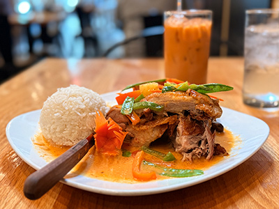 Let me say again that the duck is extraordinary. The crispy skin is heavenly. You will want to order the Red|Yellow|Green Curry version rather than the Lovely Duck Creamy Special version because the latter smothers the duck in the curry sauce and mitigates the crunch. Not counting the duck leg, the duck is mostly deboned, making it easy to eat. I found two extra bones in it, a rib and a joint that was part of the leg, but overall this was beautifully executed. The included steak knife easily cut through the pieces and all pieces were meaty and delicious. You really can't get much better duck anywhere unless you get a good one in Chinatown. A good curry makes you want to sop up the last remnants of it with rice. You might even find yourself wanting more curry and rice. Only Indian curries can rival these kinds of flavors, but I would say Thai curries have an edge over Indian curries for me, if only because they are sweeter in taste. In the background is the requisite single-person serving of steamed rice and a lovely glass of Chateau de Coca-Cola, vintage 2026, a most complementary pairing.